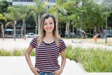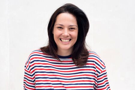 Portrait of fashion brunette woman wearing a striped blouse and jeans isolated on white background in studio