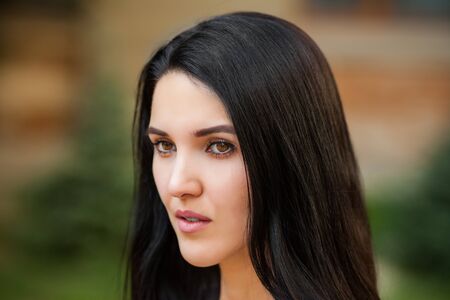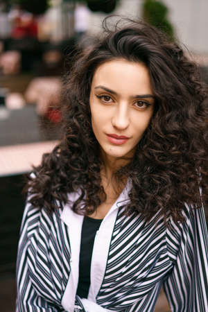 Female portrait close-up, curly hair dark brown eyes, posing on the street . Beautiful brunette woman