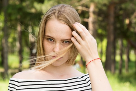 Close-up of thoughtful girl in a striped dress looking at the camera. Beautiful blonde with freckles on a blurred background of nature