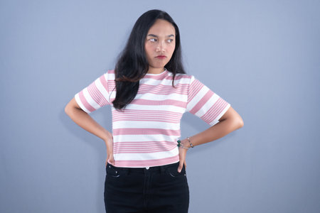 A young woman in a striped shirt with her hands on her hips, looking to the side with an annoyed expression.
