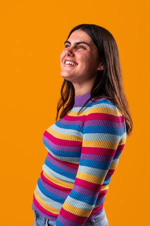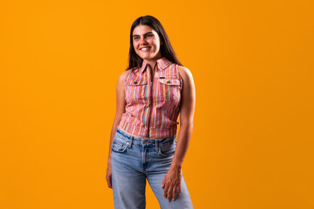 Stylish young woman with long brown hair, wearing a colorful striped top and jeans, smiling confidently against a vibrant orange backdrop illuminated by softbox lighting
