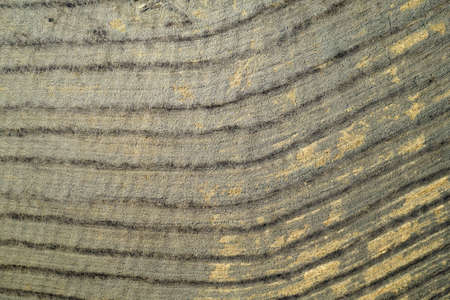 Cross section of natural wood. Split log wooden texture photo with light and darker brown patches. Close up top view.