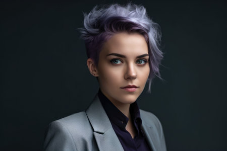 Portrait of a confident businesswoman with baby purple hair, wearing a smart suit and posing against a sleek metallic background