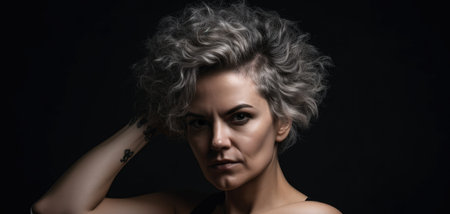 Close up of beautiful woman with white skin, grey short hair, wavy hair and a clear black t shirt, isolated in a light white studio. Portrait person.