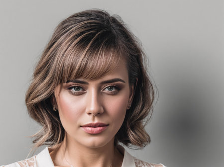 Pretty girl with casual makeup posing with interest on light background Lovable shorthaired lady with dark eyes standing in studio with serious face expression : Generative AI