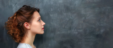 A young woman with curly brown hair stands in profile, looking to her right. She is wearing a light-colored shirt. The background is a gray wall with a textured surface.