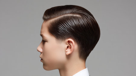 A striking side profile of a young boy showcasing a sleek and polished hairstyle. The minimal background enhances the modern and elegant appearance, perfect for various projects.