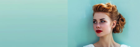 Portrait of an elegant, sexy smiling woman with perfect skin and short red hair, on a dark blue background, banner. Advertising of cosmetic products, spa treatments, shampoos and hair care, dentistry and medicine, perfumes and cosmetology for women.