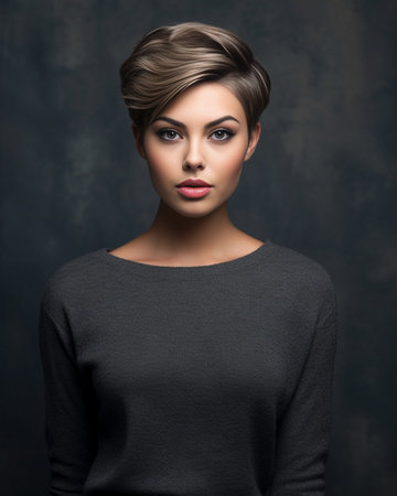 A high-quality image of a woman with a trendy pixie cut, showcasing a bold and edgy look with well-defined layers and a stylish finish.