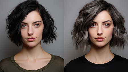 Side-by-side comparison of a woman suffering from hair loss before and after treatment, shown in a collage format on grey background