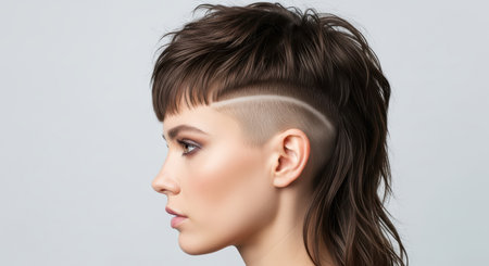 A side profile of a woman with a stylish undercut hairstyle, with the shaved area featuring a unique pattern.