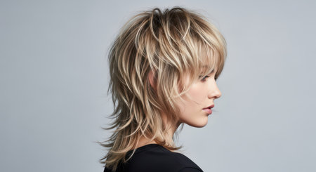 A woman stands in profile her tousled hair framing her face softly. She exudes confidence and grace set against a neutral background that highlights her features.
