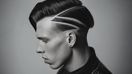 Evocative black and white portrait of a young man showcasing a distinct haircut with artistic shaving elements, highlighting personal style and confidence in grooming.