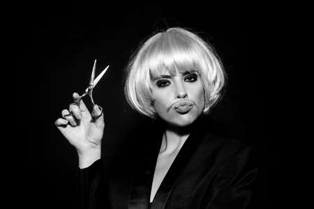 Woman with scissors having vogue hair cut. Fashion girl with straight hair with professional scissor. Haircare concept.