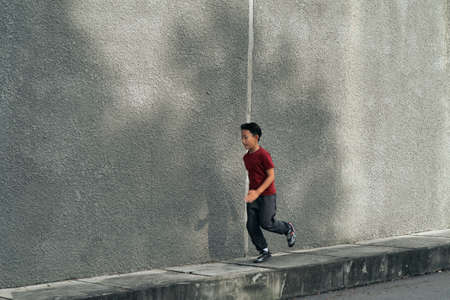 Young asian boy running and work out in outdoor. Active kids. Self care and health care concept.