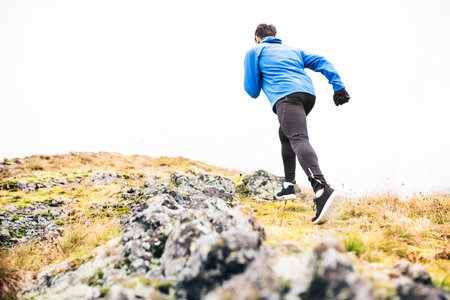 A sporty man hiking trail run mountain, extreme sport outdoor.