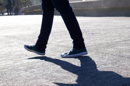 Legs of a young man walking on the street, close-up