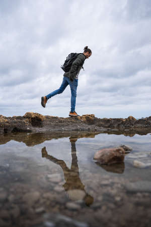Man balancing on the edge of a puddle in which he is reflected. On a cloudy day. He is wearing a green jacket, gray sweater and jeans. Caucasian, with ponytail and rucksack on his back.