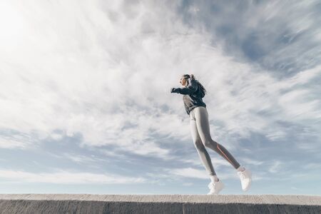 active young girl runner goes in for sports outdoors, runs against the sky, is charged with energy and forces