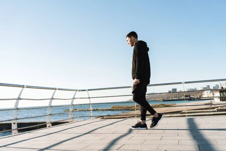 Photo of joyful guy 20s in black clothes walking along wooden boardwalk by seaside after morning workout