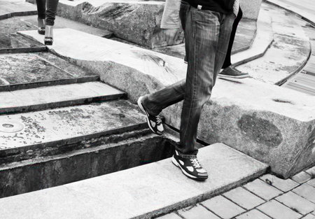 Young fashion man's legs in sneakers on stairs
