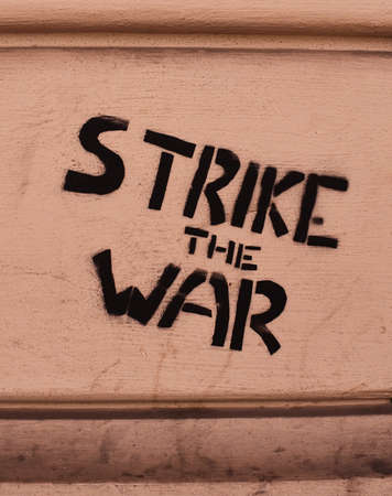 Letters laid out in the word Stop the war on a red, gloomy background, in full screen.