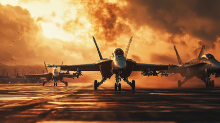 Multiple military jets line up on a runway as the sun sets, casting a golden glow and creating a dynamic atmosphere. The pilots are ready to takeoff in a powerful display of aviation.