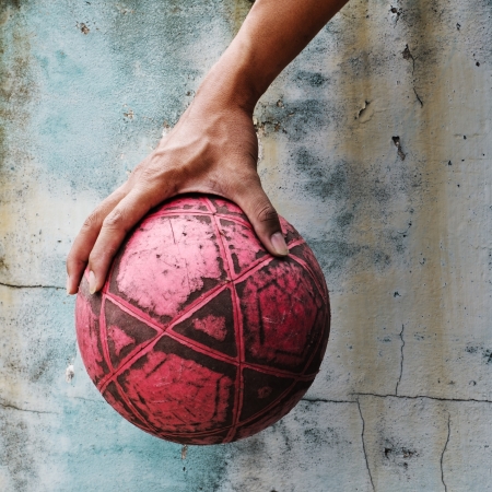 A well-worn Sepak Takraw ball on a rough outdoor court, showing signs of frequent play.