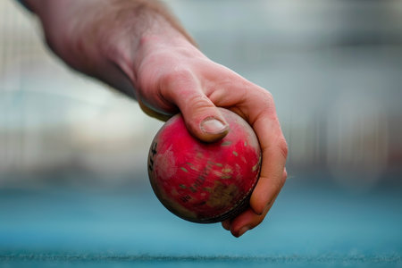 Closeup of a bowlers hand releasing a red ball, A close-up of a bowler's hand releasing the ball