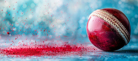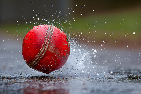 A cricket ball glistens with raindrops as it sits on a damp, vivid green pitch. the blurred background and ambient lighting evoke a tranquil yet dynamic atmosphere, the interplay between nature and sport. Generative AI