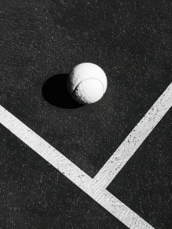 Minimalist photography, close-up of a tennis ball, on a tennis court, top-angle shot, Black and white image