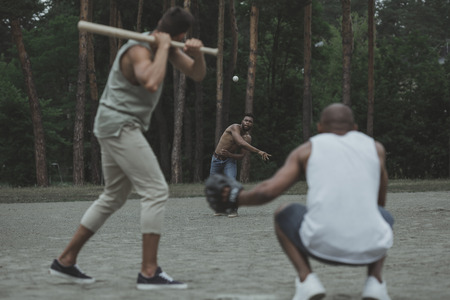 Men playing baseball game. Batter getting ready to hit a pitch during ballgame on a baseball diamond, field.