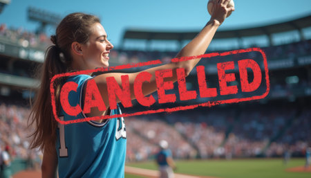 A joyful young woman in a blue sports jersey raises her arm at a lively baseball game, but the image is marked with a bold CANCELLED stamp. This striking contrast captures the excitement of the moment while highlighting the disappointment of an event that wont take place.