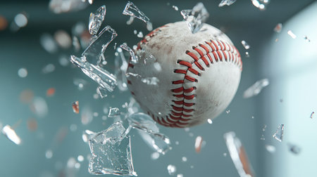 A stunning sports image capturing a baseball mid-flight as it shatters a glass surface, showcasing an exhilarating moment filled with motion and impact.