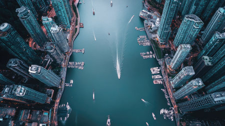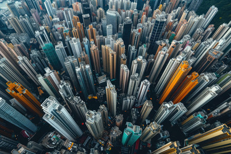 This photo showcases a birds-eye view of a city, highlighting its towering buildings and bustling streets, Aerial shot of a skyscraper dominated business district, AI Generated