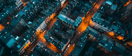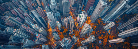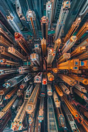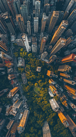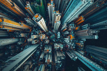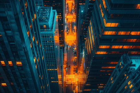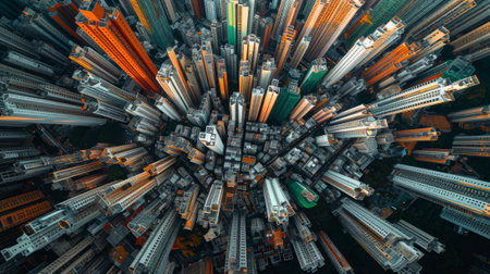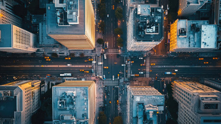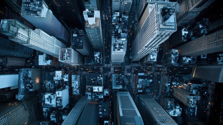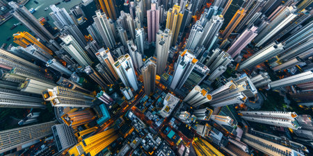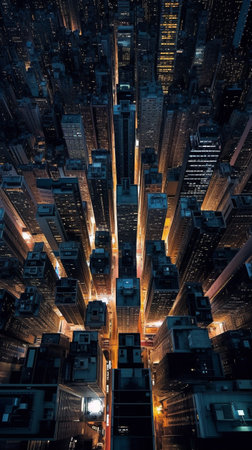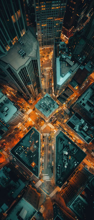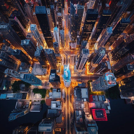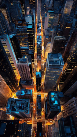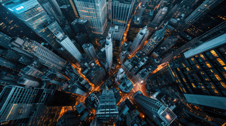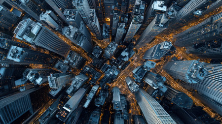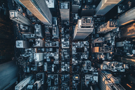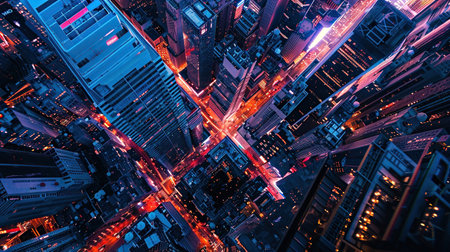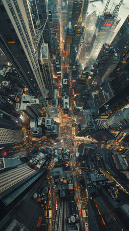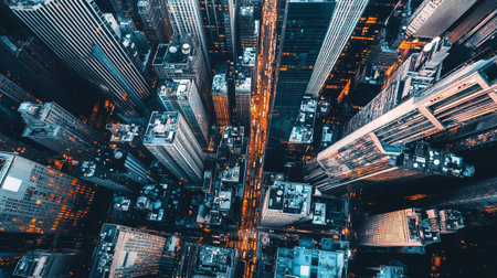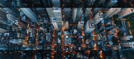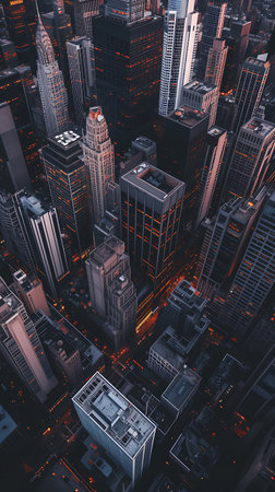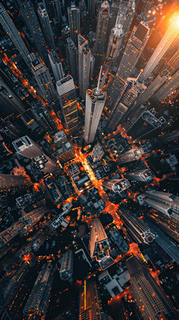Stunning aerial view of a bustling urban cityscape at dusk, showcasing towering skyscrapers illuminated by city lights. The intricate layout reveals dynamic energy and architectural beauty.