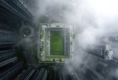 An overhead shot reveals a stadium with a green field, encircled by high-rise buildings. The scene is enveloped in a dense fog, creating a moody ambiance. The composition highlights the geometric shapes and textures, with possible uses in architectural, environmental or conceptual projects.