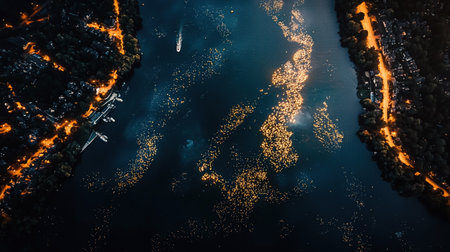 An aerial view of a city at night with illuminated buildings and water, creating a stunning visual display.