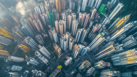 Aerial view showcasing tall skyscrapers and urban buildings in a vibrant city during early morning hours with soft light illuminating the scene.