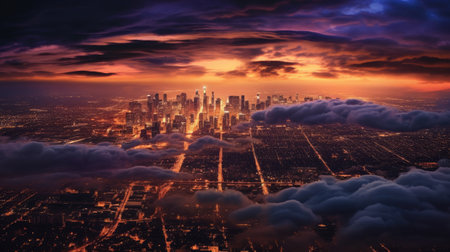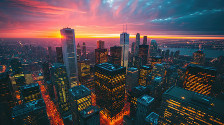 Aerial view of a bustling urban skyline during sunset, showcasing towering skyscrapers and vibrant city lights