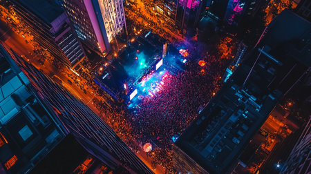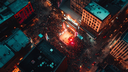 An aerial shot at night showcasing a bustling city square brimming with people enjoying an event.