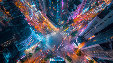 Top-down city intersection with heavy car traffic illuminated by colorful neon signs and skyscrapers, symbol of modern financial connectivity