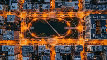 Aerial view of a city park at night with a pond and bridge surrounded by illuminated buildings and streets.