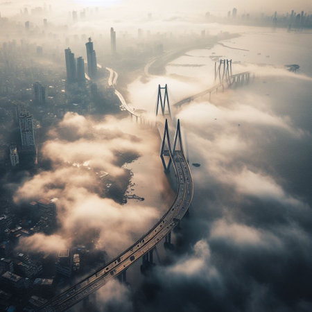 An awe-inspiring aerial perspective captures a sprawling city skyline partially obscured by a thick, ethereal blanket of morning fog. The tops of skyscrapers and taller buildings emerge from the mist like islands in a sea of white, creating a mysterious and serene atmosphere. The soft, diffused light of dawn casts a gentle glow, highlighting the vastness of the urban landscape. conveys a sense of quiet grandeur and the hidden potential within the city.