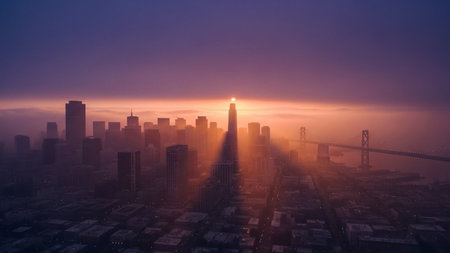 A dramatic aerial view of the San Francisco skyline at sunset, enveloped in a thick layer of fog. Sunbeams pierce through the haze, creating striking light rays that illuminate the city's skyscrapers and the iconic Bay Bridge. The sky is a gradient of deep purple and warm orange, adding to the moody and atmospheric of the scene. captures the grandeur and mystique of the urban landscape at twilight.