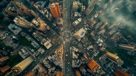 Aerial view of a busy city center with tall buildings and open streets, with copy space available in the roads