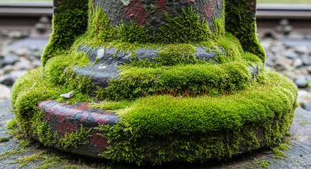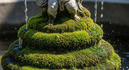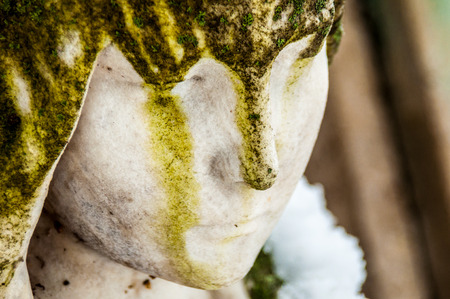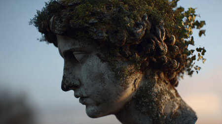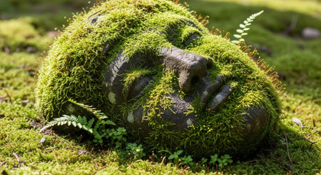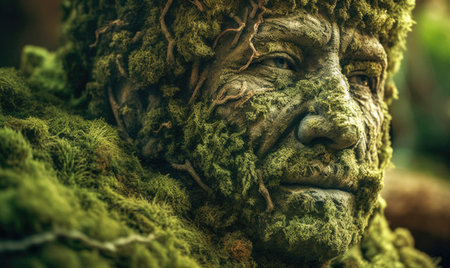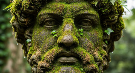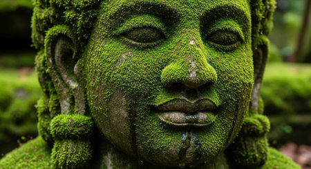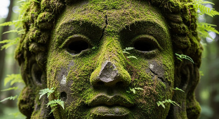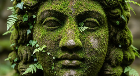 A closeup of a mosscovered statue with fuzzy green tendrils clinging to its features and adding an element of organic texture to the otherwise solid and smooth stone