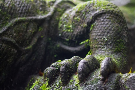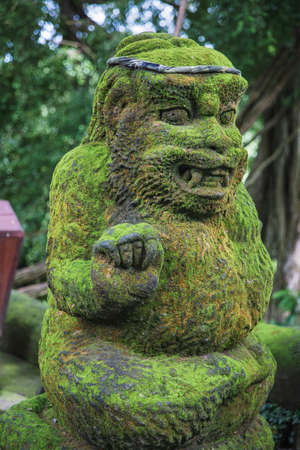 Balinese Carved Stone Statue of Rakasa covered with green moss. at Hindu Temple.