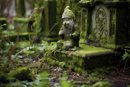 moss-covered broken gnome in a forgotten garden, created with generative ai