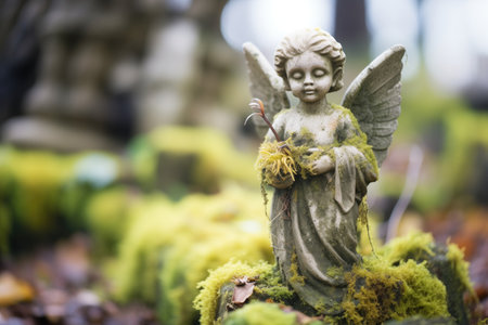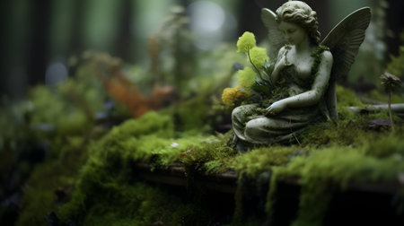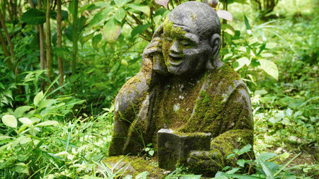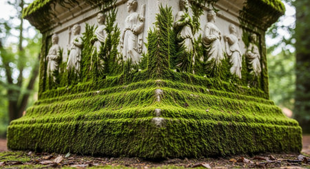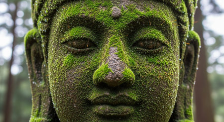 A tranquil close-up of a moss-covered statue nestled in a serene forest, reflecting the beauty of nature and the passage of time in a peaceful setting.